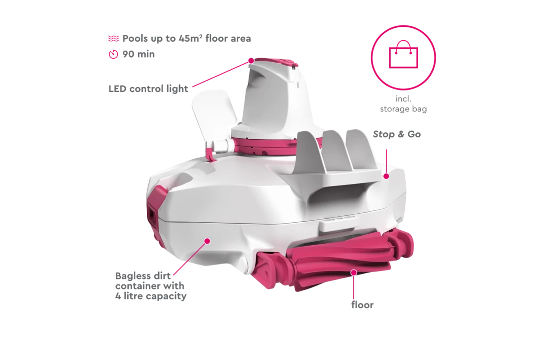 Geen stroomaansluiting of kabel nodig in de buurt van het zwembad, oplaadbare batterij met looptijd tot 90 minuten.