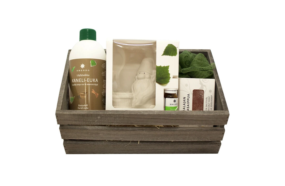 Geschenkmand bevat saunageur kaneel-euca 500 ml, saunakabouter wit + eucalyptus 10 ml, groene wasbloem en Himalayazoutzeep 240 g Geschenkmand bevat saunageur kaneel-euca 500 ml, saunakabouter wit + eucalyptus 10 ml, groene