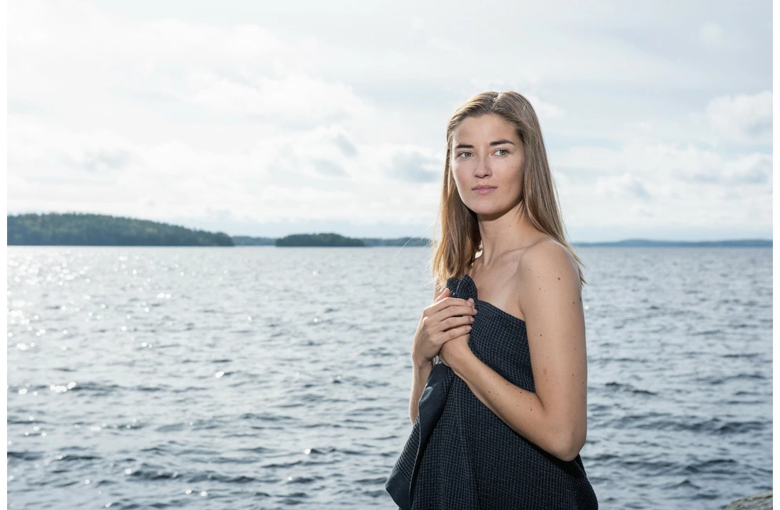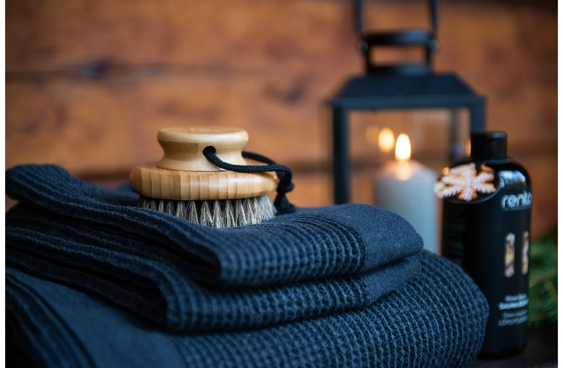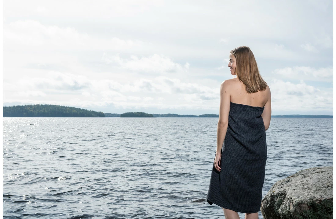 Nieuw kleur! Comfortabele handdoek met chambray randen. Kenno saunatextiel is gemaakt van gerecycled katoen, waardoor de stof een natuurlijke zachtheid en levendige textuur krijgt.