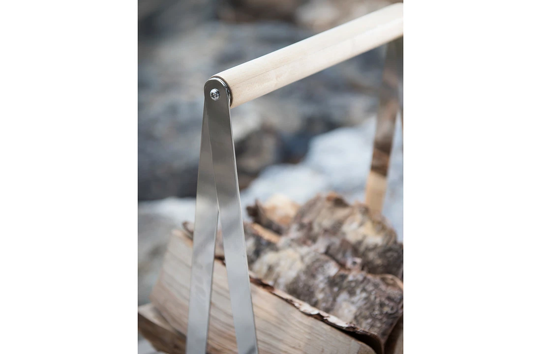 Het brandhout rek is speciaal ontworpen door Harri Koskinen. Het brandhoutrek is speciaal gemaakt van glanzend staal en het handvat is van berken. De samenwerkingscollectie met H. Koskinen heeft een stijlvol en eenvoudig ontwerp.