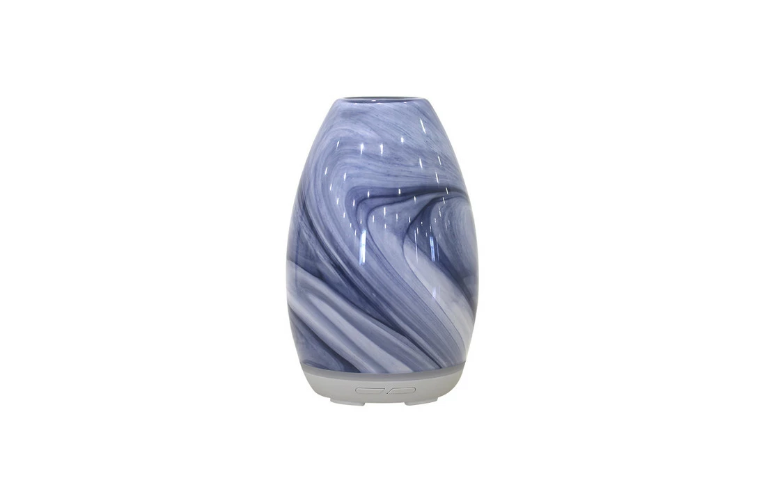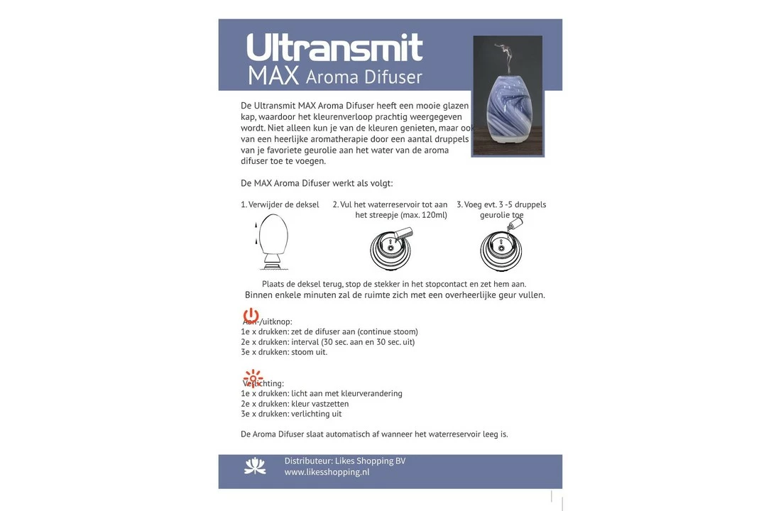 De Ultransmit Aroma Diffuser is zeer geschikt voor het verdampen van essentiële oliën. Het water in de Aroma Diffuser wordt door middel van trillingen met een hoge frequentie omgezet in stoom, waardoor een koude verneveling ontstaat. De Aroma Diffuser is hierdoor uitstekend geschikt om in huis, kantoor-, salon- en praktijkruimte te gebruiken. De Aroma Diffuser Max F is voorzien van een mooi glazen kap met verschillende soorten blauwe tinten in verwerkt zijn. De Aroma Diffuser heeft een fraaie verlichting. De kleuren van de verlichting lopen op een rustgevende manier in elkaar over, maar kan ook op één kleur vastgezet of helemaal uitgezet worden.